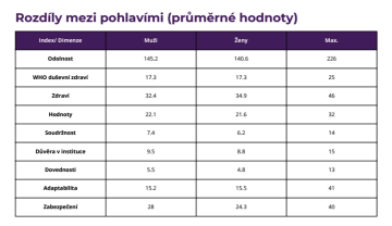 Výsledky ukazují, že Vy, kteří jste si test odolnosti udělali 14. listopadu 2025, tvoříte odolnou a stabilní skupinu, která se opírá o silné hodnoty a dobré psychické i fyzické zdraví. Muži i ženy se v mnoha indexech liší jen minimálně, což ukazuje na celkově vyrovnaný profil Vaší skupiny. Přestože většina účastníků vykazuje vysokou úroveň odolnosti, data ukazují i několik oblastí, ve kterých má naopak Vaše skupina rezervy a které mohou být užitečné pro další rozvoj: Index dovedností (relativní výkon 32.3 %), a Adaptabilita (31.4 %)).