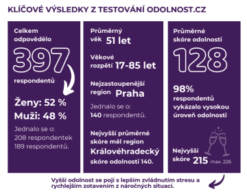 Děkujeme, že jste se dne 14. listopadu 2025 zapojili do testování osobní odolnosti po odvysílání rozhovoru Ivany Tykač v pořadu Rozstřel na iDNES.cz. Odolný člověk není superhrdina. Je to někdo, kdo zvládá realitu takovou, jaká je. Když přijde stres, ví, jak ho ustát. Když se podmínky mění, dokáže se přizpůsobit. Když narazí na problém, hledá řešení místo rezignace. A když mu dojdou síly, ví, jak je obnovit nebo kdy požádat o pomoc. Odolnost není o tom být stále silný, ale o tom zůstat funkční. Umět se ohnout, ale nezlomit. Ztratit rovnováhu a znovu ji najít. Reagovat, nehroutit se. To je odolnost, kterou chceme společně rozvíjet. Díky Vašim odpovědím vznikl tento unikátní datový přehled o odolnosti a zdraví účastníků z celé České republiky. Níže naleznete několik zajímavých zjištění.