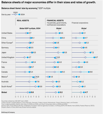 MGI začal globální rozvahu sledovat v roce 2021 a sestavuje ji součtem všech reálných aktiv v ekonomice (včetně nemovitostí, infrastruktury, strojů, duševního vlastnictví a dalších, například komodit) a všech finančních aktiv a závazků (například akcií, dluhopisů, úvěrů, hotovosti a vkladů či penzí) – vše oceněno tržními cenami. Tento „globální“ pohled zahrnuje data z hlavních ekonomik, které dohromady představují více než 70 % světového HDP.