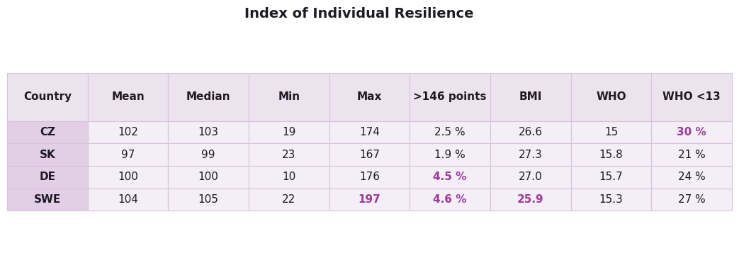 Just as we expected Sweden to achieve a significantly higher overall resilience index, we also anticipated a markedly healthier population. In this respect, the findings were even more surprising. Although the average BMI was the lowest among the four countries, it still approached 26 points. The mean WHO mental health index score was 15.3 points, which is fully comparable to both the Czech Republic and Slovakia. Moreover, Sweden also exhibited a high proportion of individuals (27 %) whose mental health index score lies at a threshold indicative of potentially more serious psychological difficulties (in this respect, the Czech Republic unfortunately ranks highest, with 30 % of respondents falling into this category).