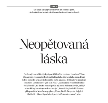 Proč mají mnozí Češi jakýsi pocit blízkého vztahu s Izraelem? Toto téma si pro svou esej vybral majitel českého i izraelského pasu, který kdysi sloužil v armádě židovského státu a napsal dvě knihy o izraelské tematice. David Shorf – jak sám říká – „nabourává rozněžnělé ideje českých elit“, na druhé straně podle něj mezi oběma národy „určitý mimořádný vztah opravdu existuje“. „Izraelští výsadkáři dodnes při opouštění letadla reagují na příkaz ‚Skoč!‘. To proto, že jejich školitelé v historii pocházeli právě z Československa,“ píše.