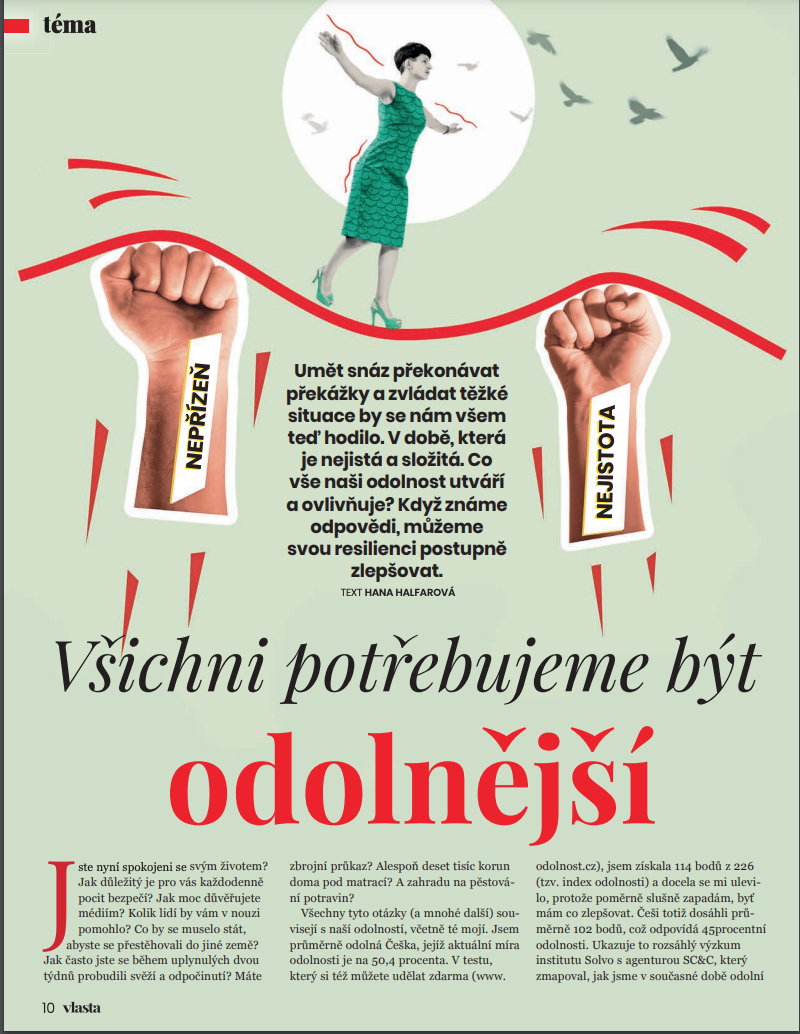 Nový průzkum institutu Solvo ukázal, že Češi nejsou tak odolní, jak si sami myslí. Index odolnosti v tuzemsku dosáhl jen 48 procent možného maxima. Češi se přitom hodnotí optimističtěji. Sami sobě přisoudili v průměru 6,3 bodu z deseti. „Index je na můj vkus dost nízký,“ říká zakladatelka institutu Solvo Ivana Tykač. Podobně jsou na tom Německo, Slovensko a Švédsko.