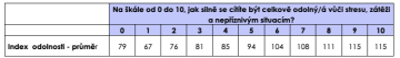 A jak to dopadne, když porovnáme subjektivní odolnost s celkovým indexem odolnosti, do kterého zahrneme všechny dimenze? Obě hodnoty spolu velmi silně korelují – lidé, kteří subjektivně vnímají svou odolnost jako nízkou dosahují velmi podprůměrných hodnot, naopak lidé, kteří se vnímají jako naprosto odolní mají také vysoký index.