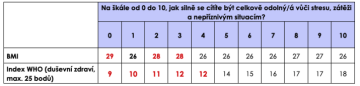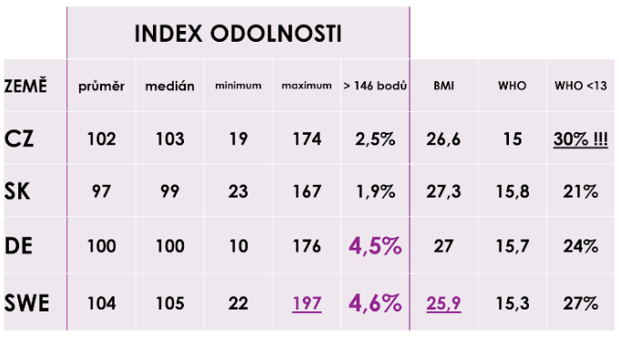 Stejně tak, jako jsme očekávali, že Švédsko bude mít výrazně vyšší celkový index odolnosti, očekávali jsme v jejich případě také výrazně zdravější populaci. Moment překvapení byl v tomto ohledu ještě výraznější, protože průměrné BMI bylo sice nejnižší ze všech čtyř zemí, ale dosahovalo také téměř 26 bodů, průměr WHO indexu duševního zdraví byl v průměru 15,3 bodů, a to je naprosto srovnatelné jak s Českem, tak i se Slovenskem. Dokonce ve Švédsku je také vysoký podíl osob (27 %), které mají tento index duševního zdraví na hranici, která může znamenat větší psychické problémy (zde bohužel „vítězí“ Česko s 30% podílem takových osob).