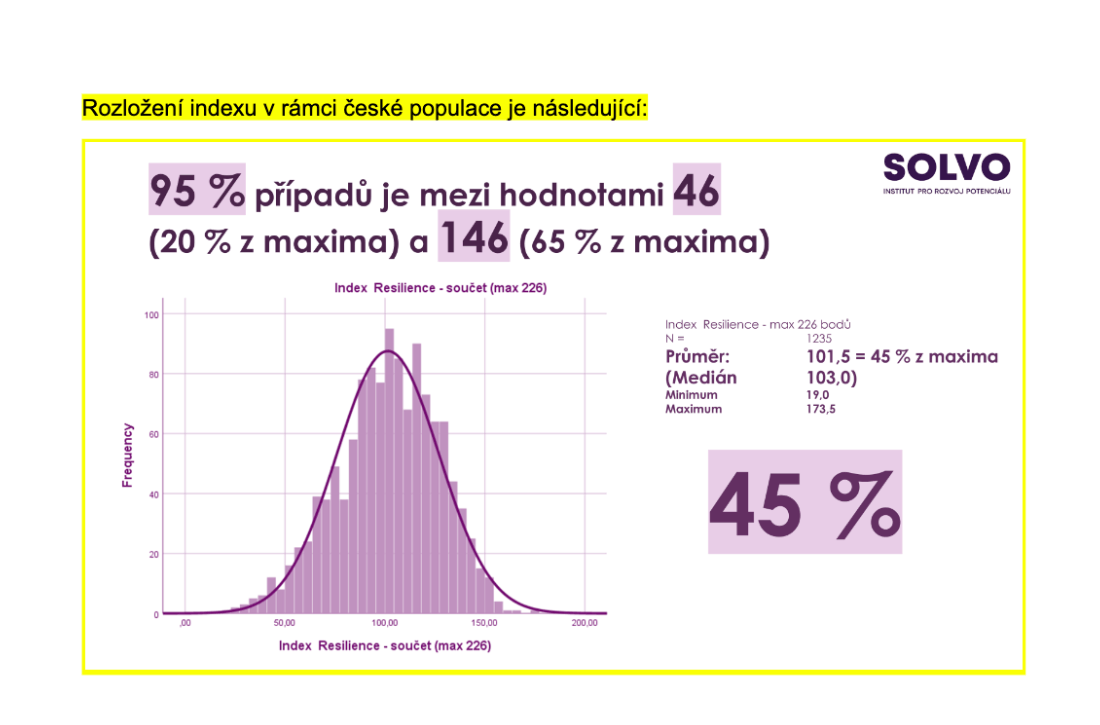 Index odolnosti vznikl součtem bodových hodnot odpovědí na 60 položek, rozdělených do 8 dimenzí. Maximální dosažitelná hodnota činila 226 bodů. Jednotlivé položky byly škálovány a přepočteny na standardizované skóre. Cílová populace byla ve věku 16 – 75 let, výzkum je reprezentativní pro tuto věkovou skupinu v rámci ČR.